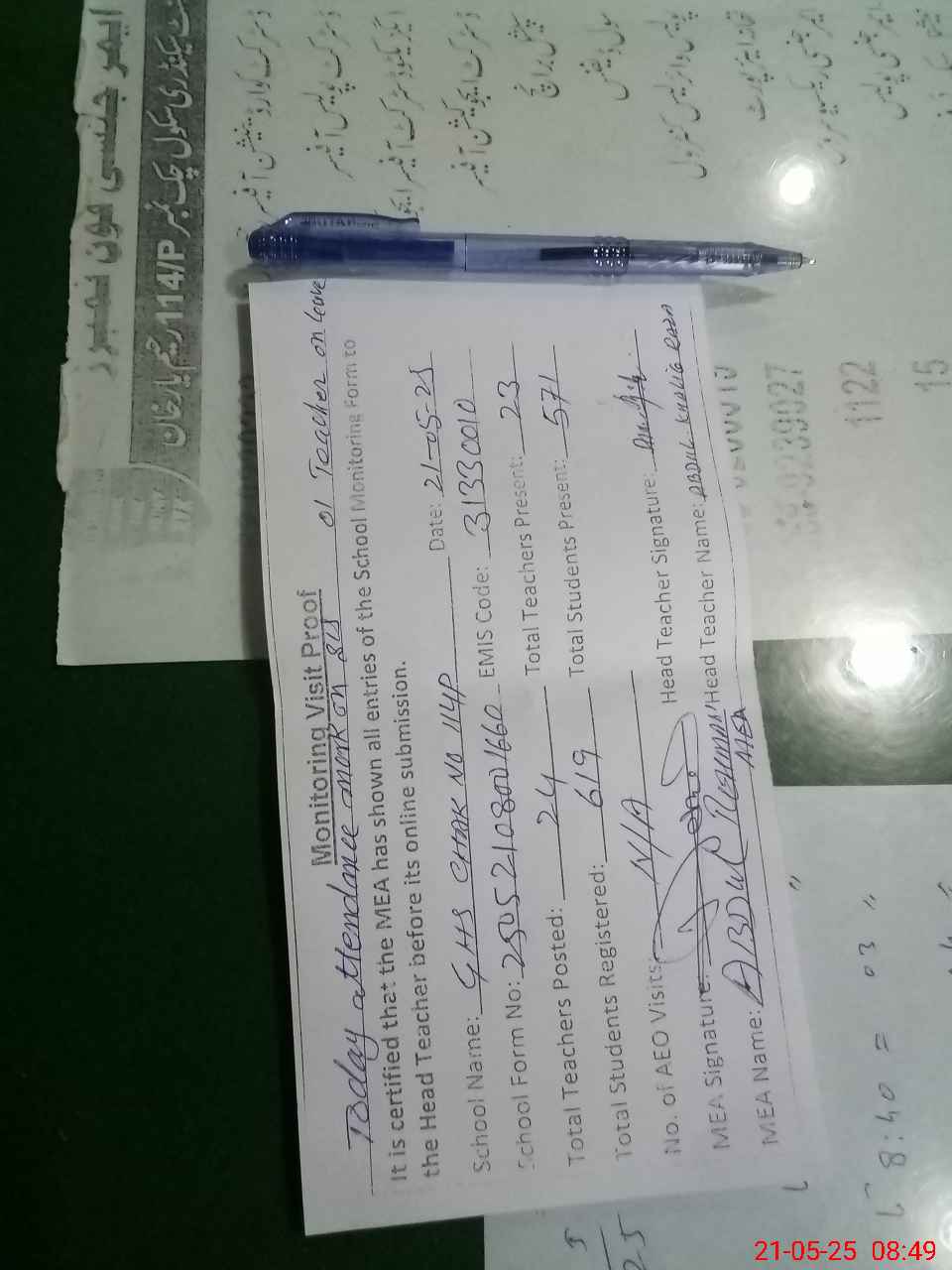 | Attendance Register | Head Teacher | MEA with School | Visit Proof |