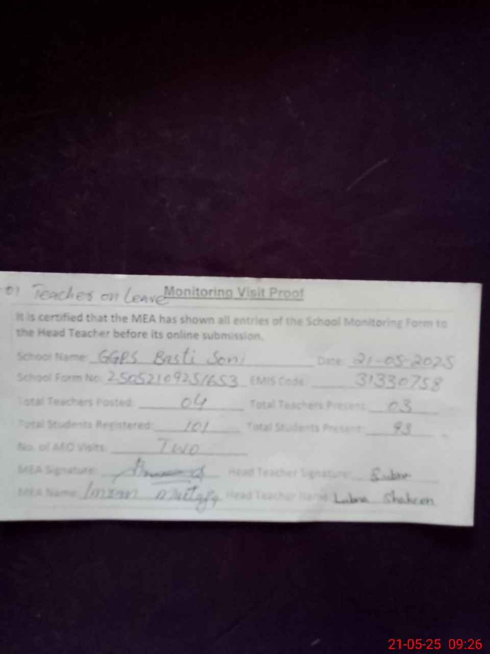 | Attendance Register | Head Teacher | MEA with School | Visit Proof |