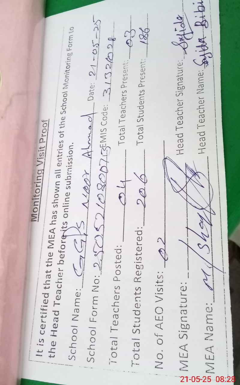 | EMIS Code: 31321028 | Name of School: GGPS NOOR AHMED BHOMB | |||
