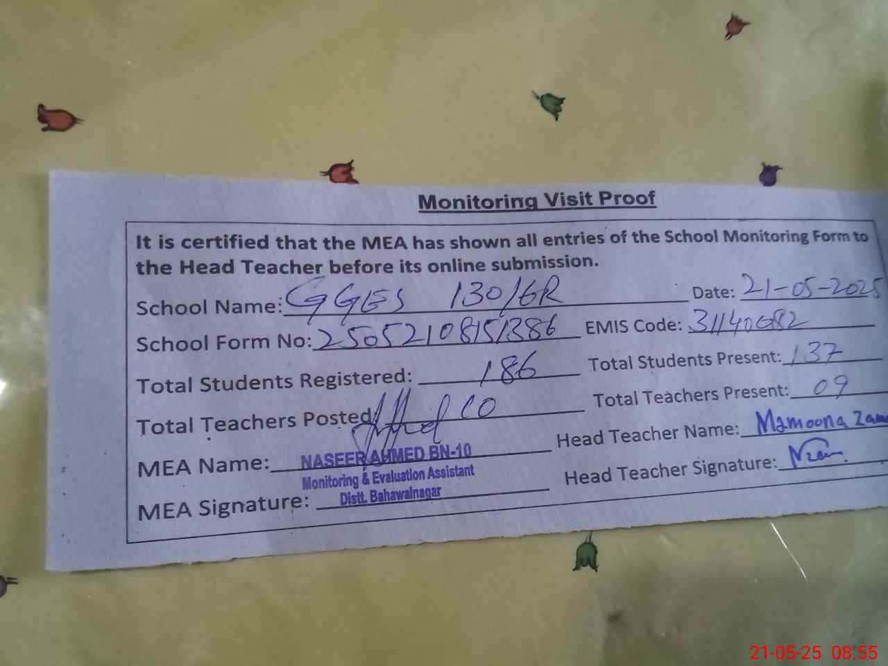 | EMIS Code: 31140082 | Name of School: GGES CHAK NO 130/6-R | |||