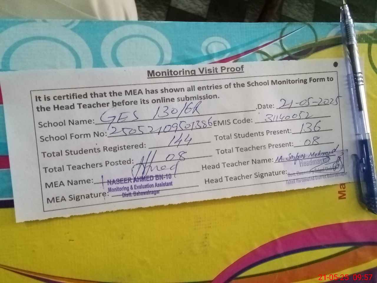 | Attendance Register | Head Teacher | MEA with School | Visit Proof |