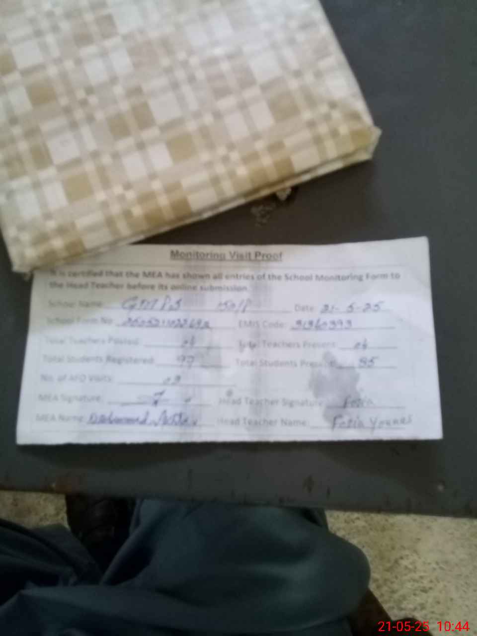 | Attendance Register | Head Teacher | MEA with School | Visit Proof |