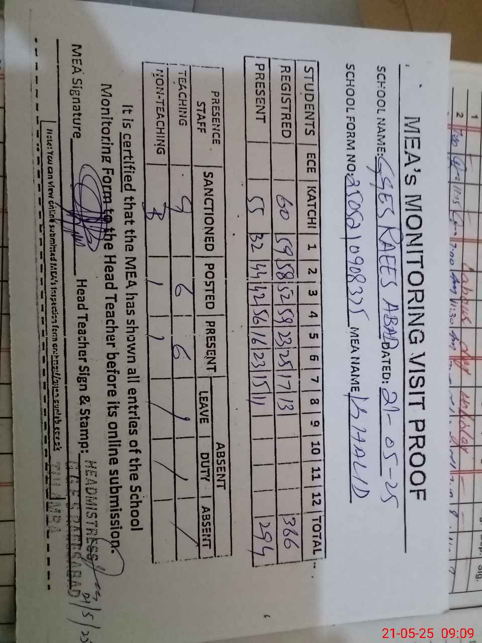 | Attendance Register | Head Teacher | MEA with School | Visit Proof |