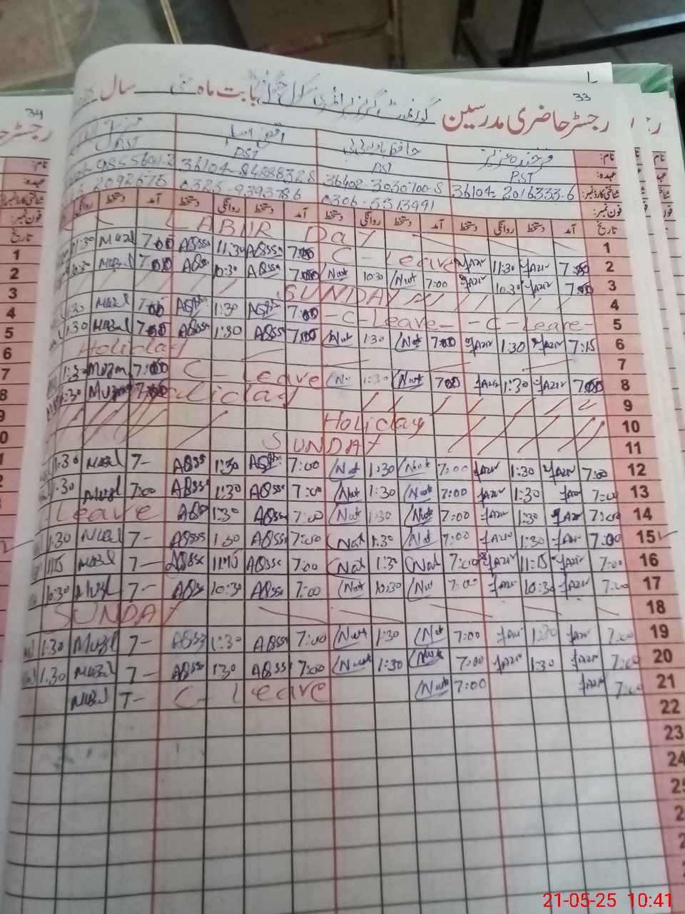 | CNIC | Full Name | Designation | R/C | Absence During Last Calender Month |