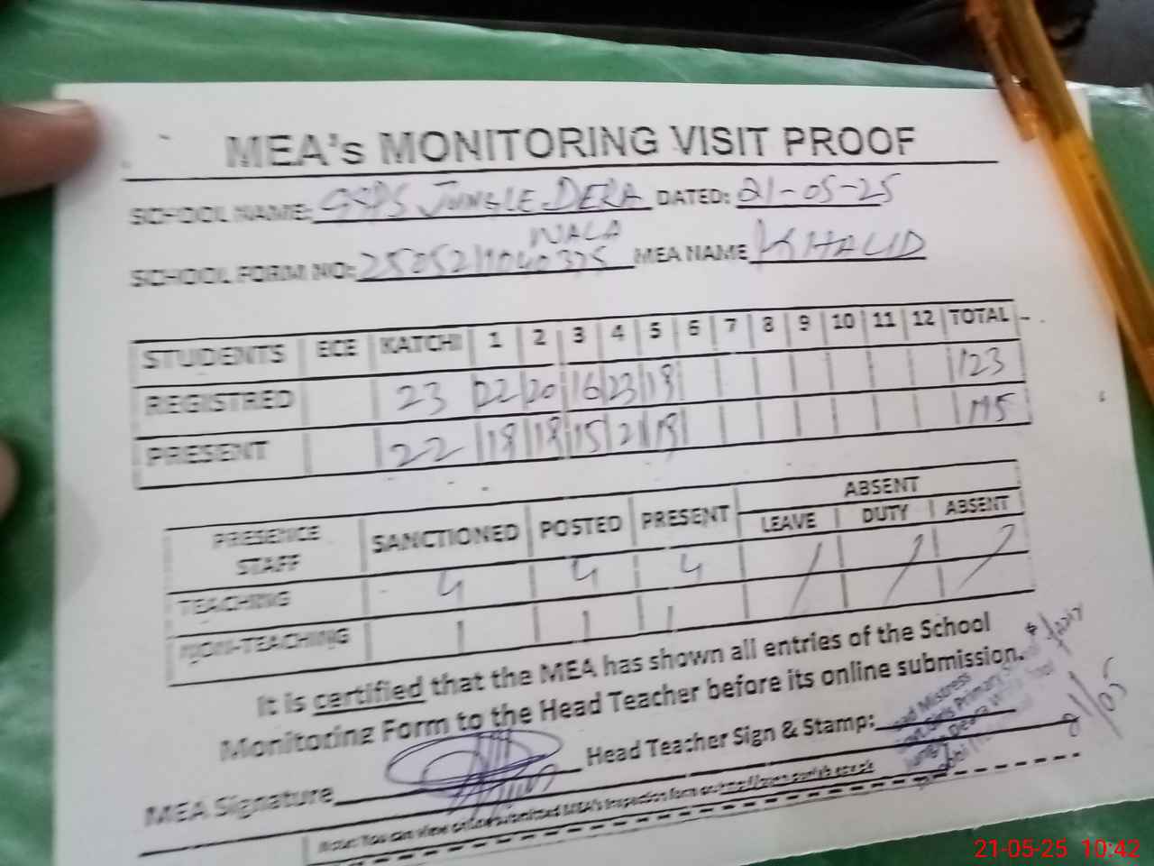 | Attendance Register | Head Teacher | MEA with School | Visit Proof |