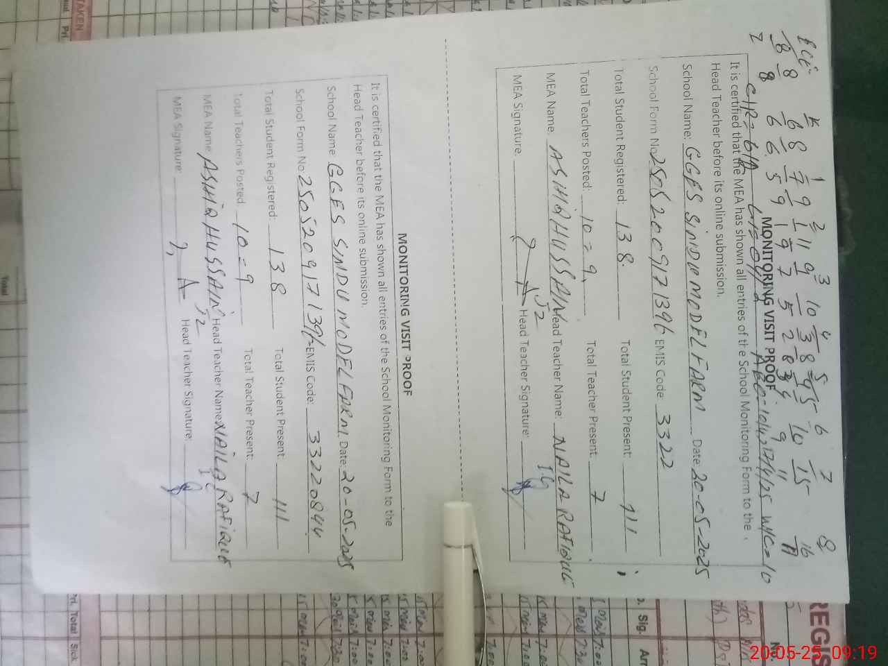 | Attendance Register | Head Teacher | MEA with School | Visit Proof |