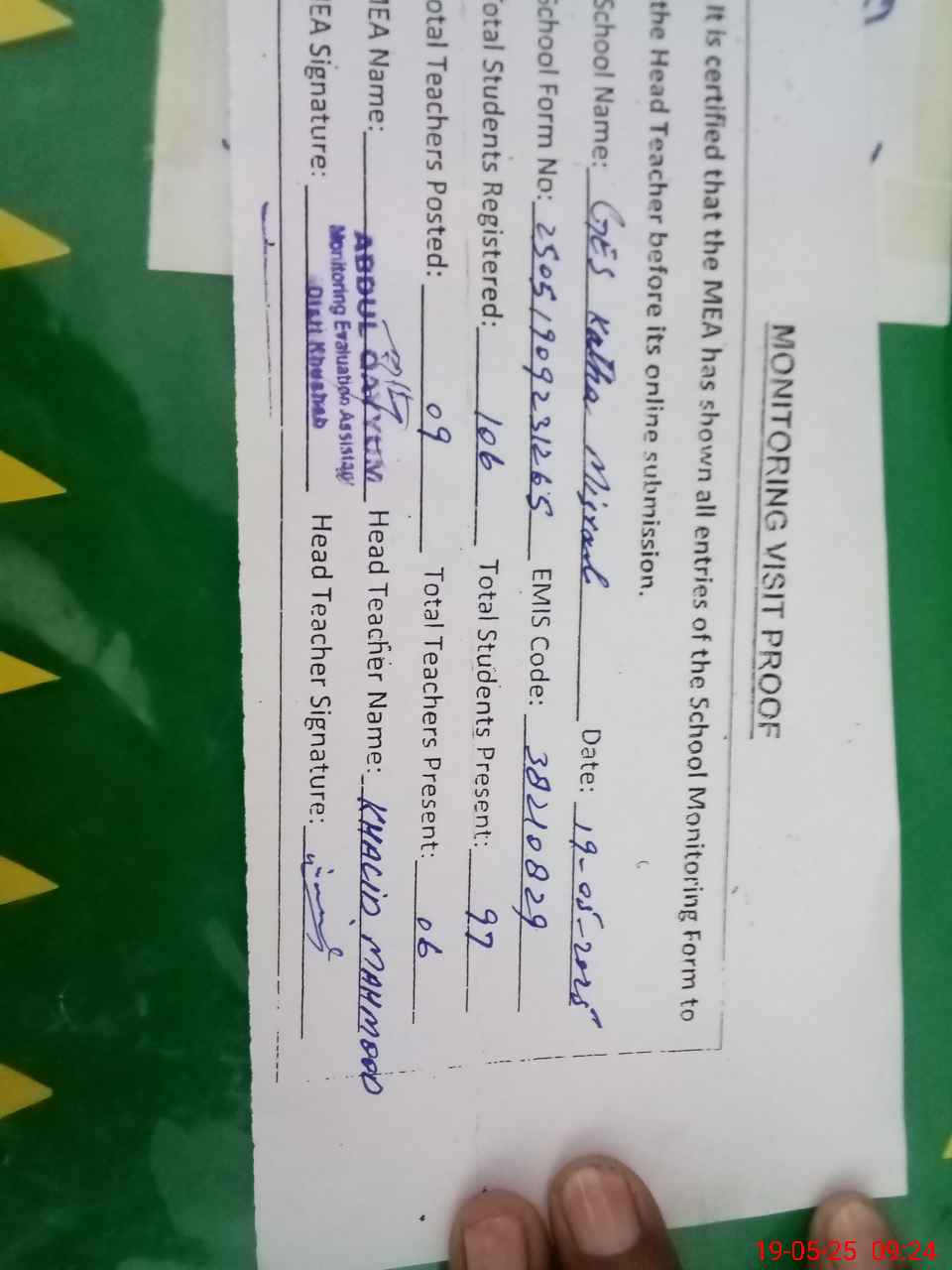 | Certified that this School was Inspected by the Undersigned MEA/DMO Today and the Information Stated Above is as Per Record. | |||||
