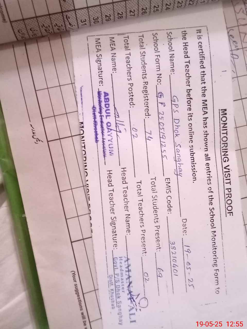 | Attendance Register | Head Teacher | MEA with School | Visit Proof |