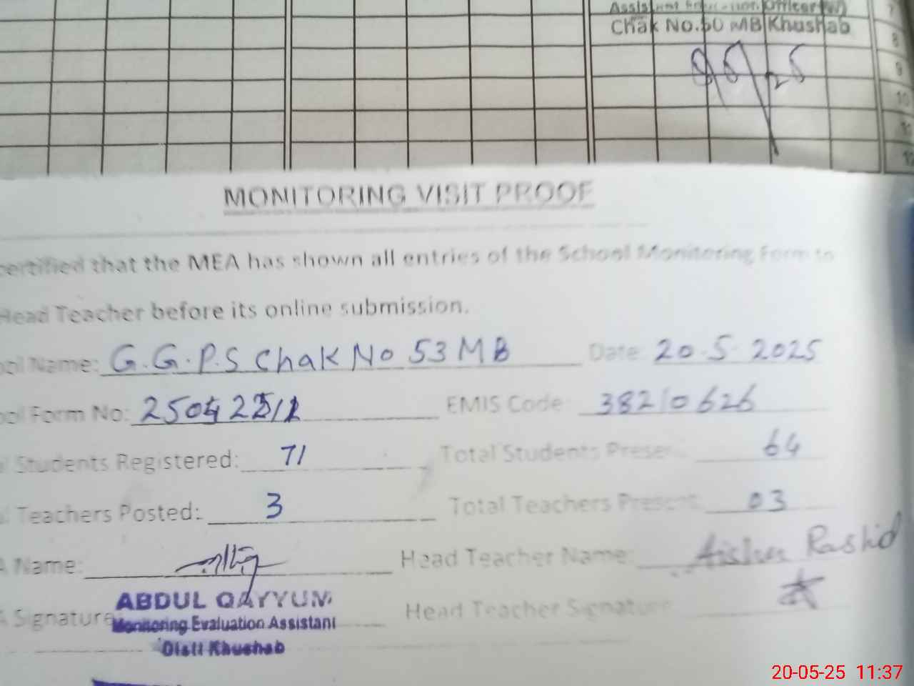 | EMIS Code: 38210626 | Name of School: GGPS CHAK NO. 53 MB | |||