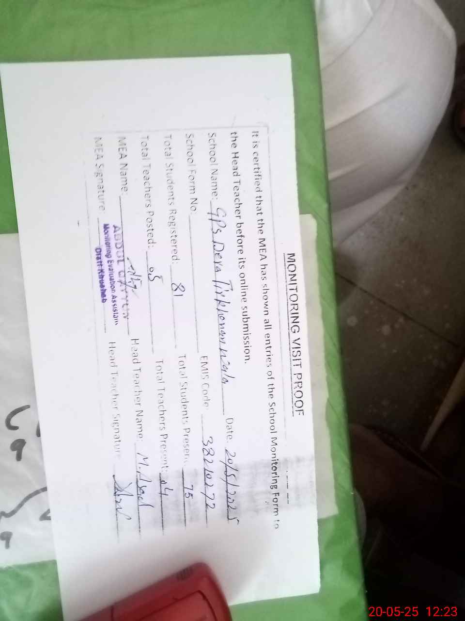 | Attendance Register | Head Teacher | MEA with School | Visit Proof |