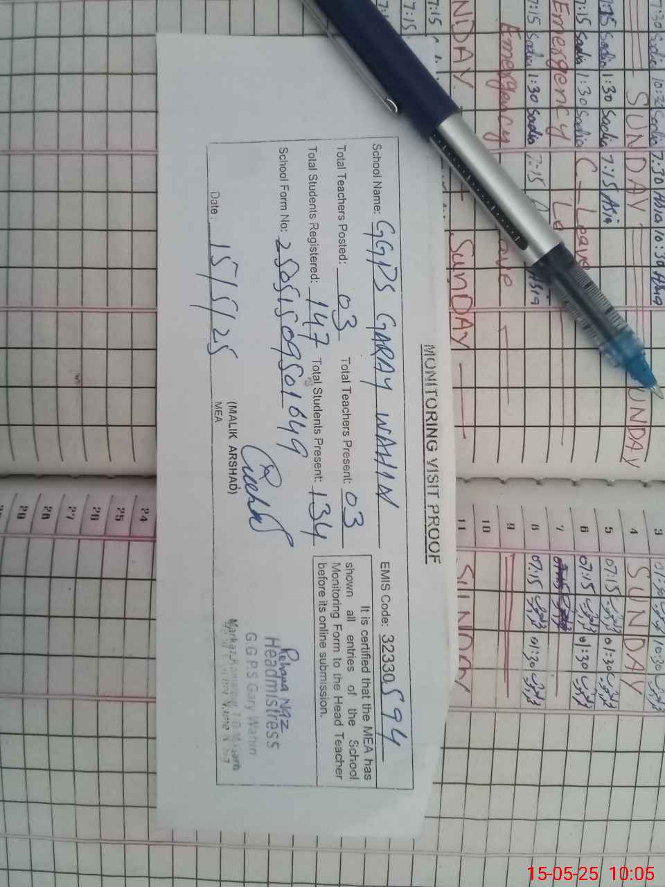 | Attendance Register | Head Teacher | MEA with School | Visit Proof |
