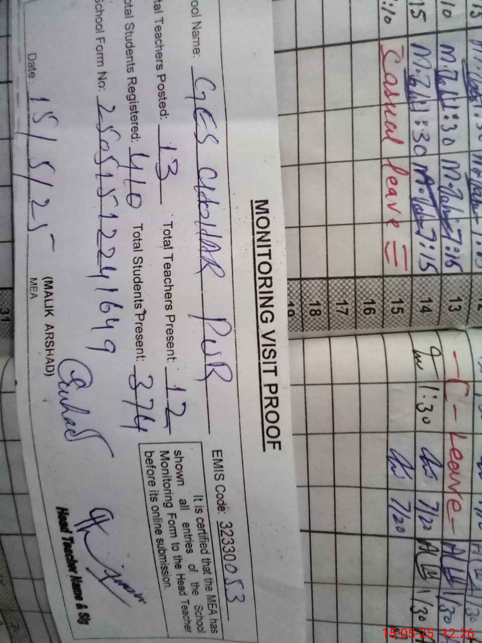 | Attendance Register | Head Teacher | MEA with School | Visit Proof |
