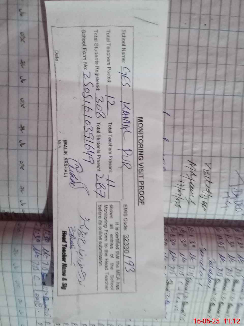 | Attendance Register | Head Teacher | MEA with School | Visit Proof |