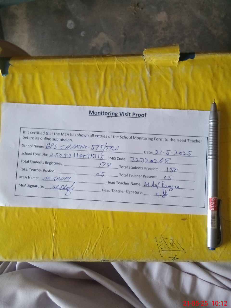 | Attendance Register | Head Teacher | MEA with School | Visit Proof |