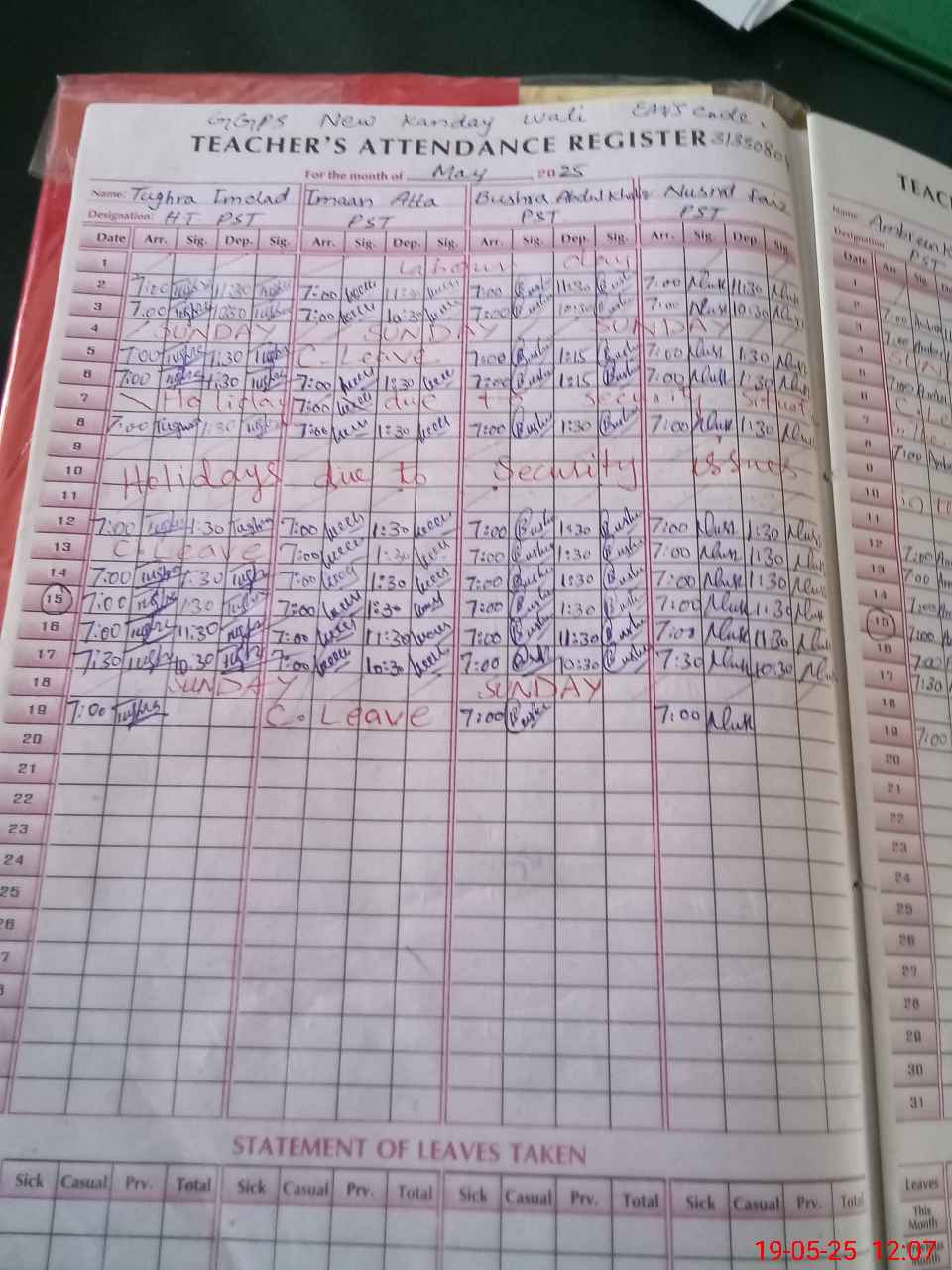 | Leave | Duty | Absent | Maternity | Medical | Ex- Pak |