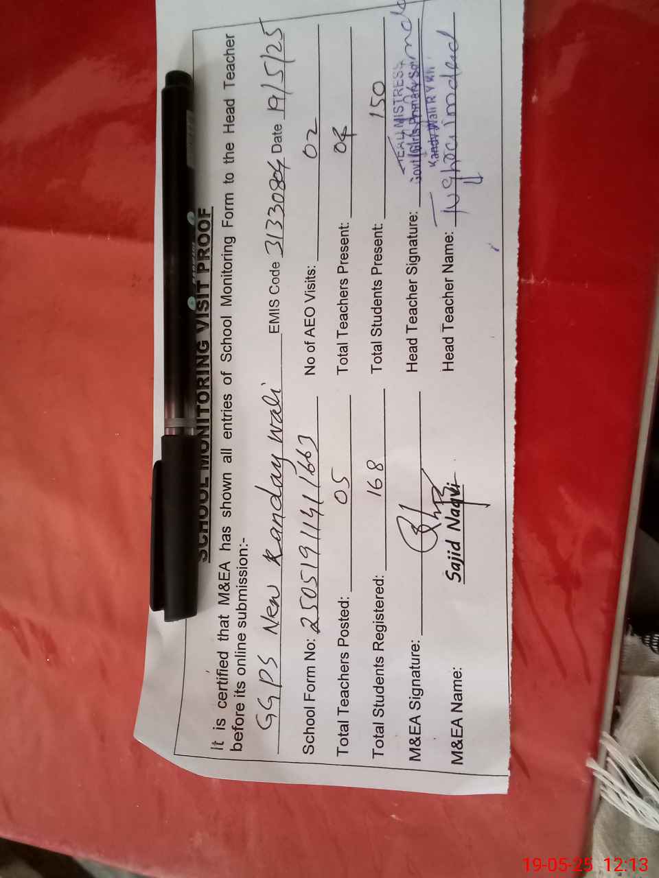 | Attendance Register | Head Teacher | MEA with School | Visit Proof |