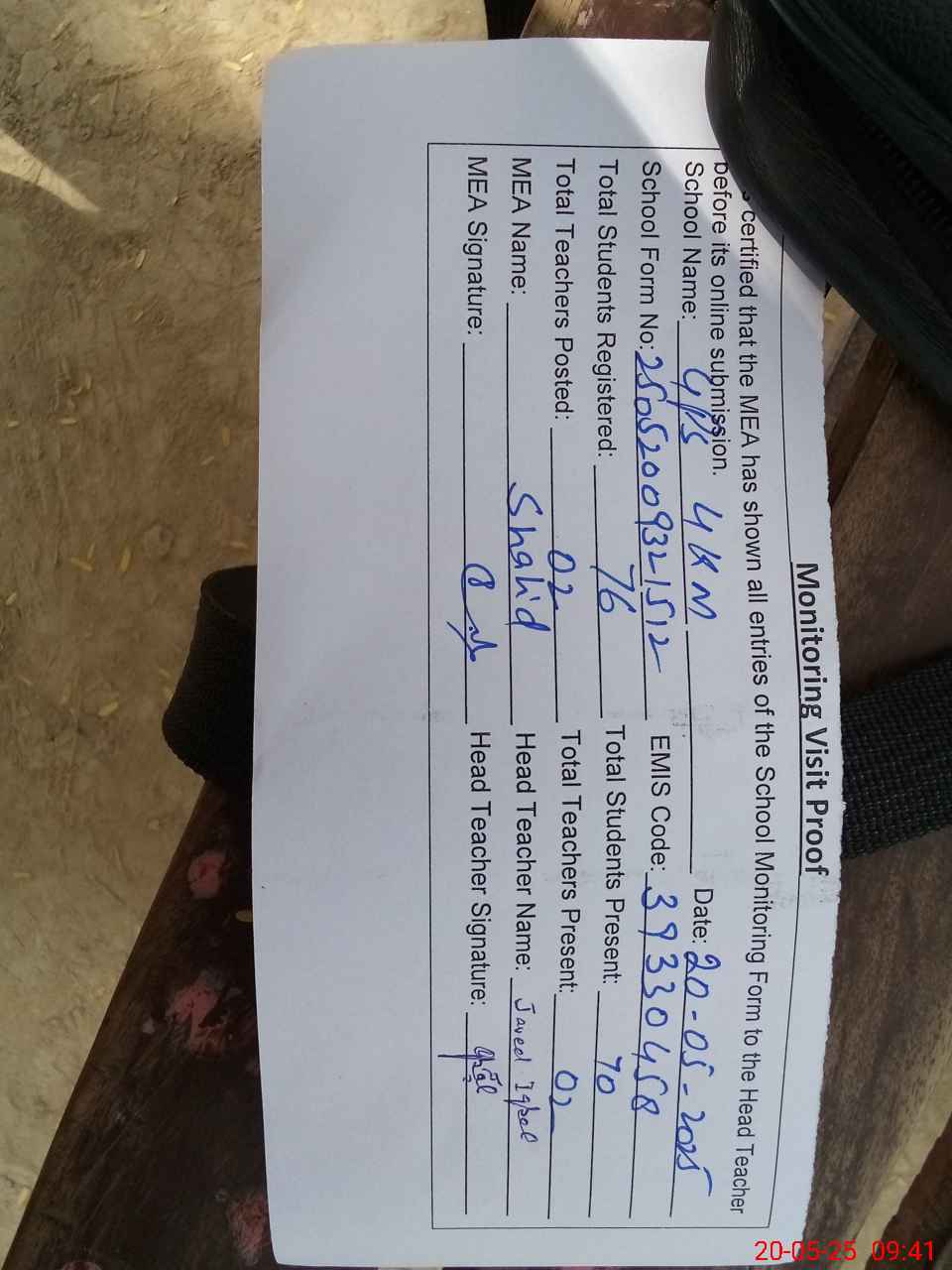 | Attendance Register | Head Teacher | MEA with School | Visit Proof |