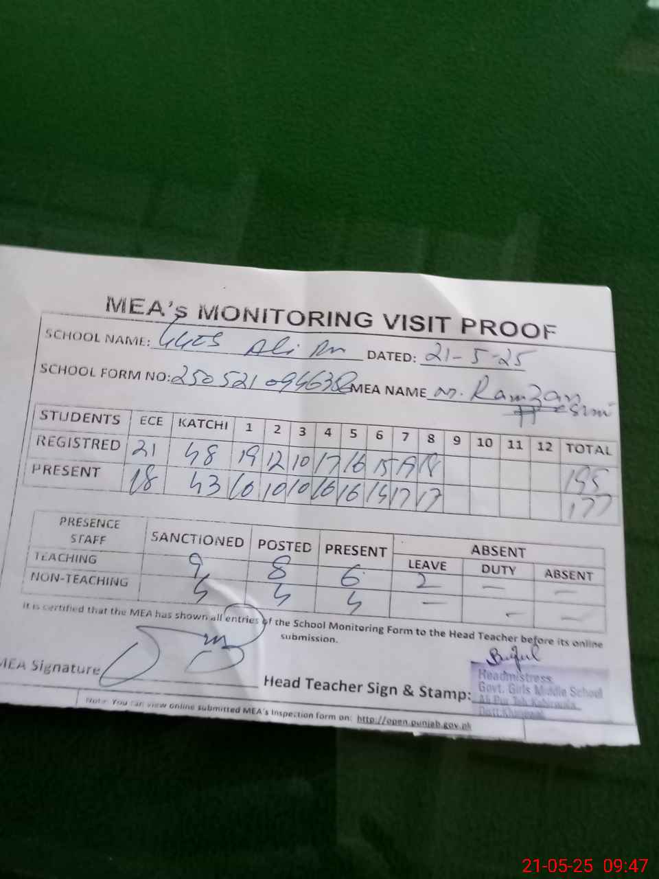 | Attendance Register | Head Teacher | MEA with School | Visit Proof |