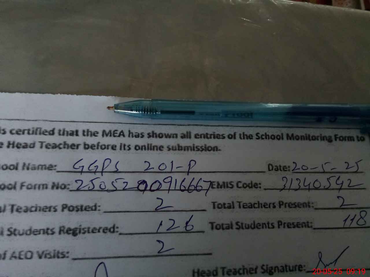 | Attendance Register | Head Teacher | MEA with School | Visit Proof |