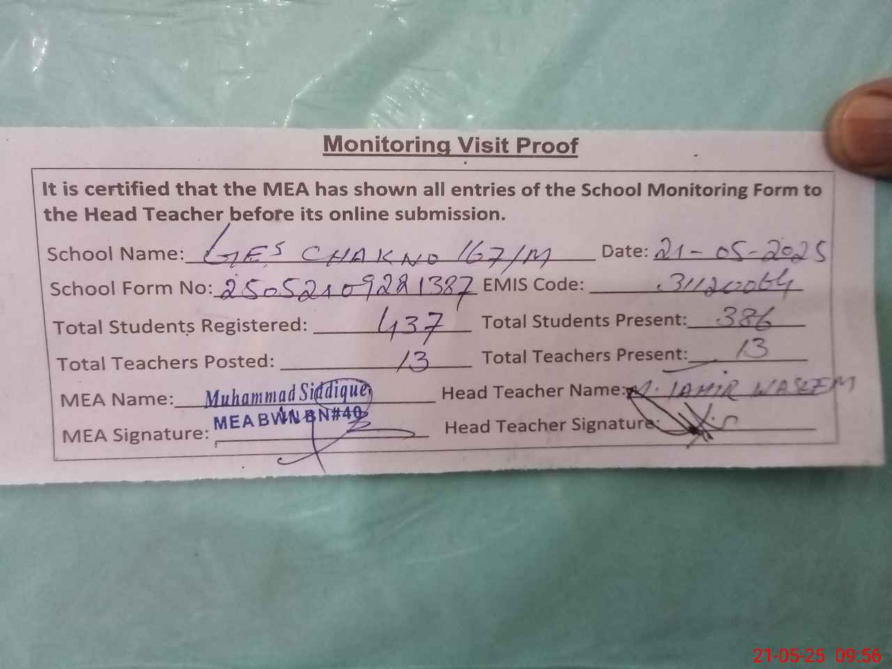 | Attendance Register | Head Teacher | MEA with School | Visit Proof |