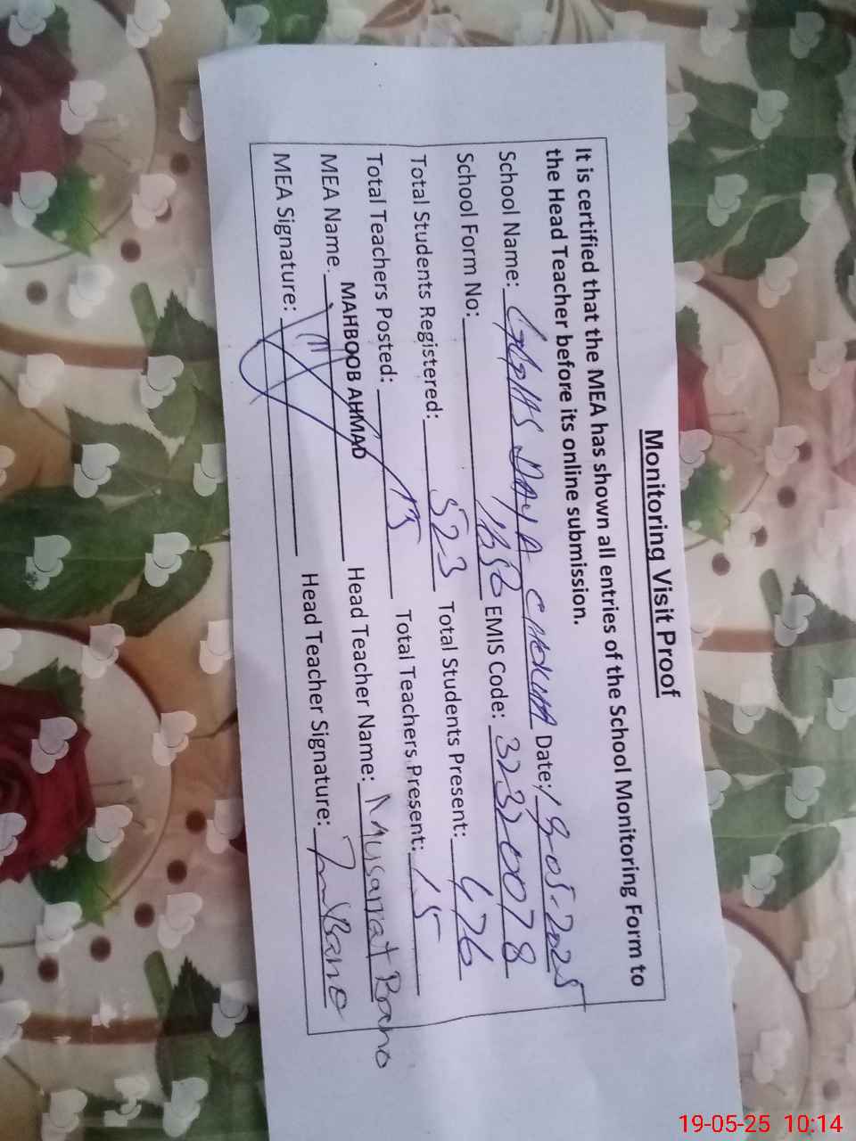 | Certified that this School was Inspected by the Undersigned MEA/DMO Today and the Information Stated Above is as Per Record. | |||||