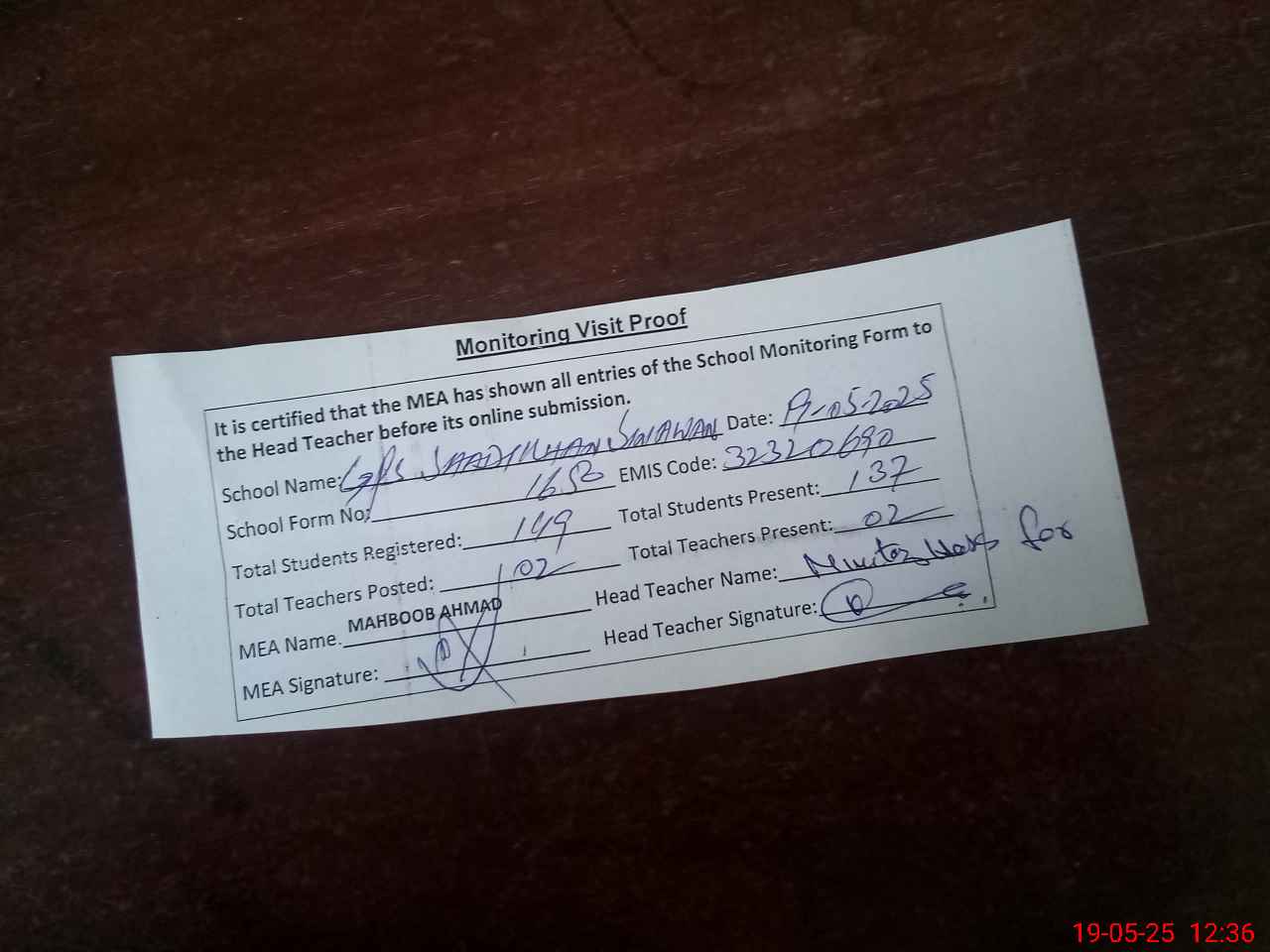 | Attendance Register | Head Teacher | MEA with School | Visit Proof |