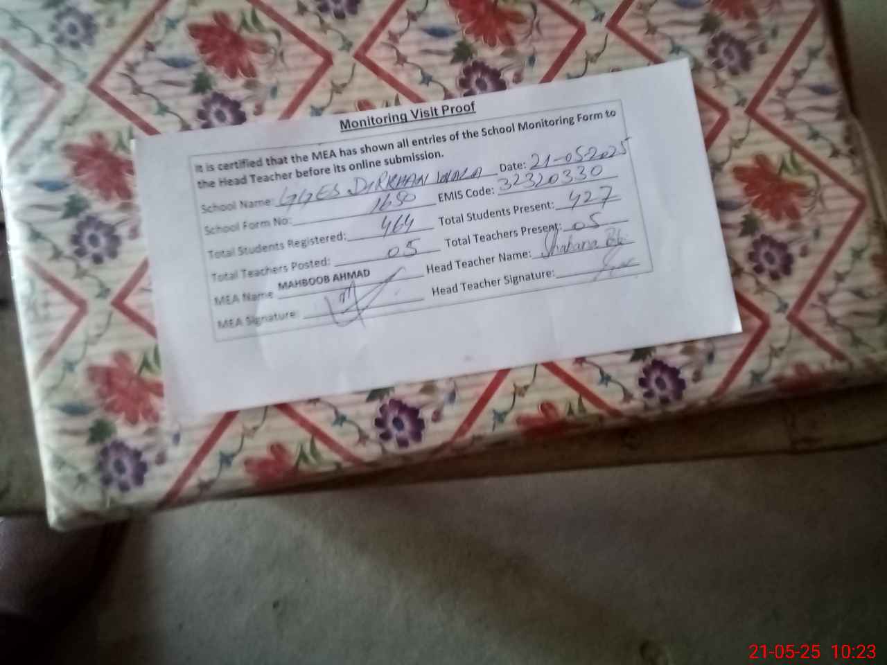 | Attendance Register | Head Teacher | MEA with School | Visit Proof |