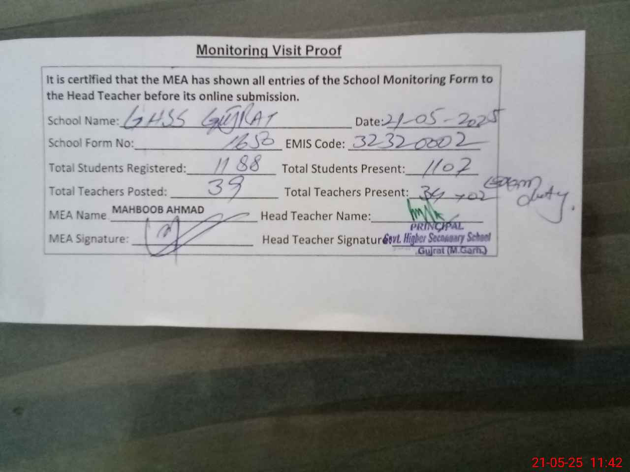 | Attendance Register | Head Teacher | MEA with School | Visit Proof |