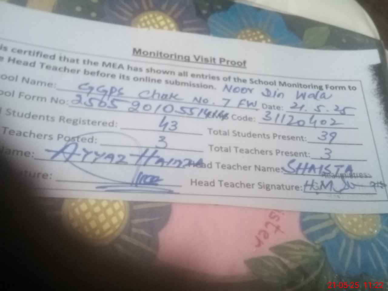 | EMIS Code: 31120402 | Name of School: GGPS CHAK 7/FW NOOR DIN WALA | |||