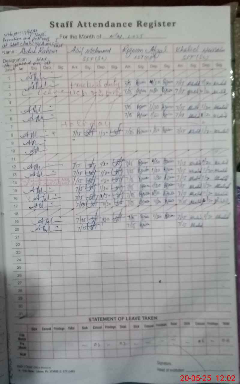 | CNIC | Full Name | Designation | R/C | Absence During Last Calender Month |
