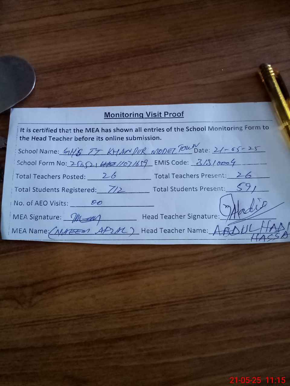 | Attendance Register | Head Teacher | MEA with School | Visit Proof |