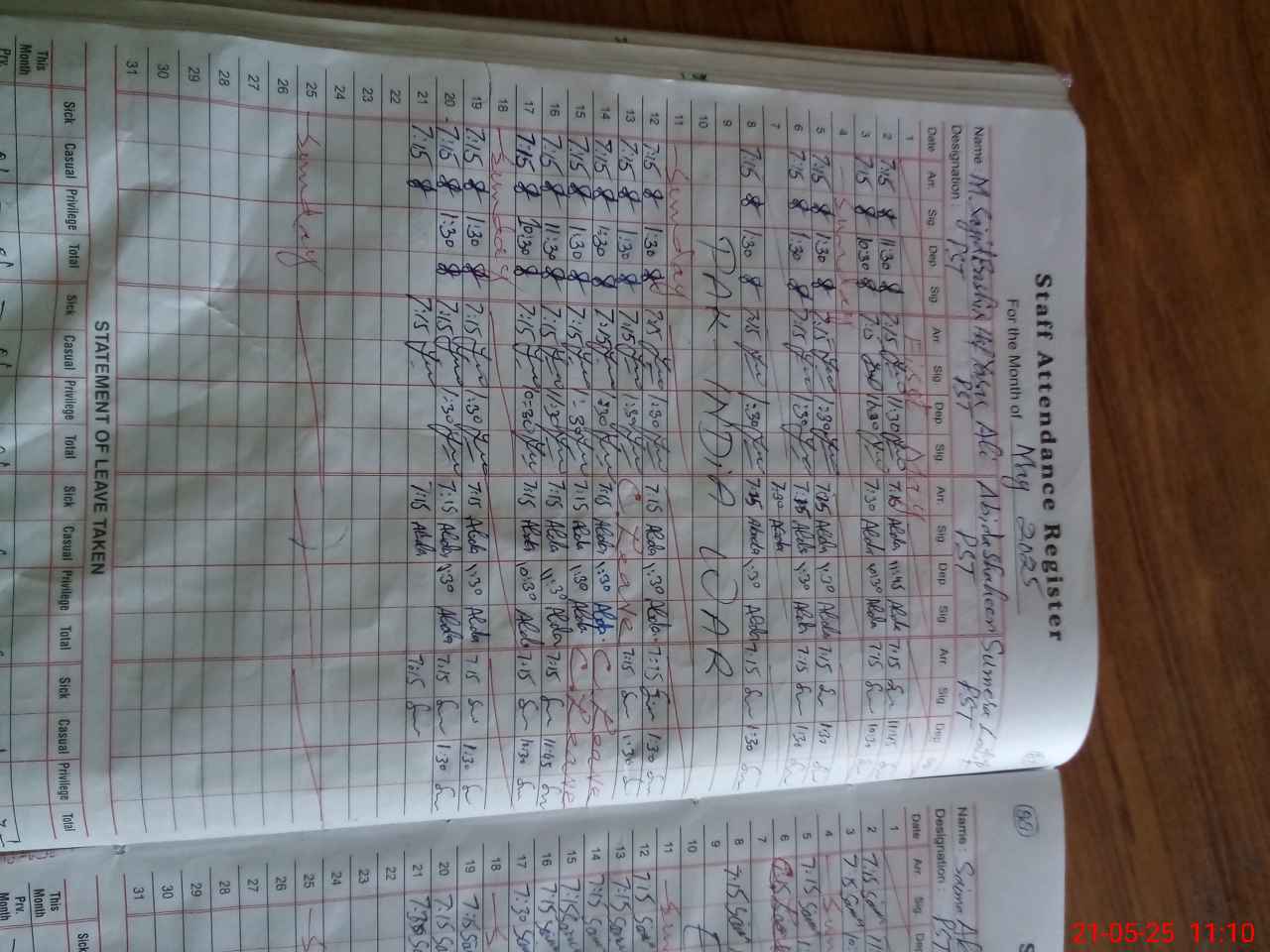 | CNIC | Full Name | Designation | R/C | Absence During Last Calender Month |