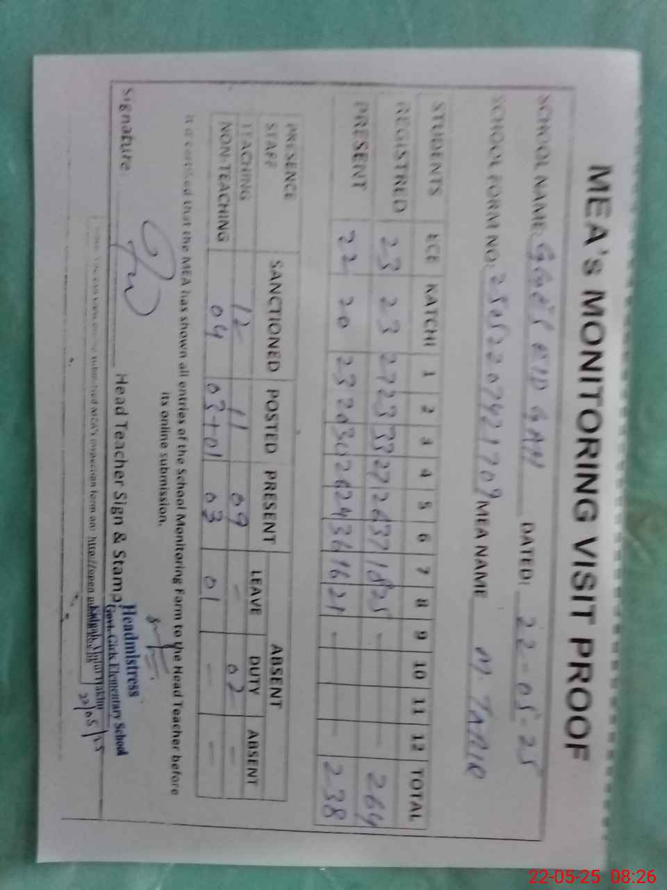 | Attendance Register | Head Teacher | MEA with School | Visit Proof |