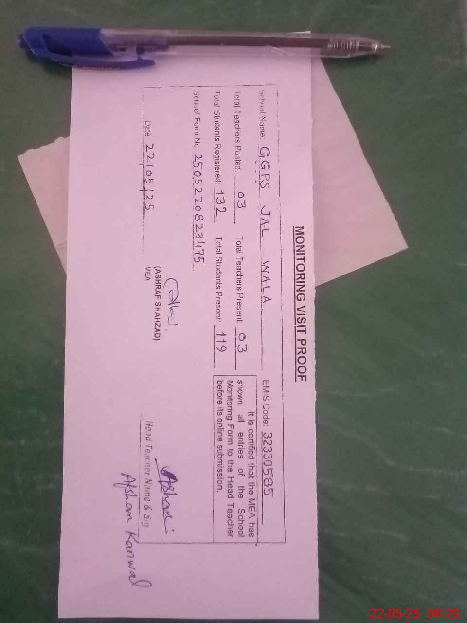 | Attendance Register | Head Teacher | MEA with School | Visit Proof |