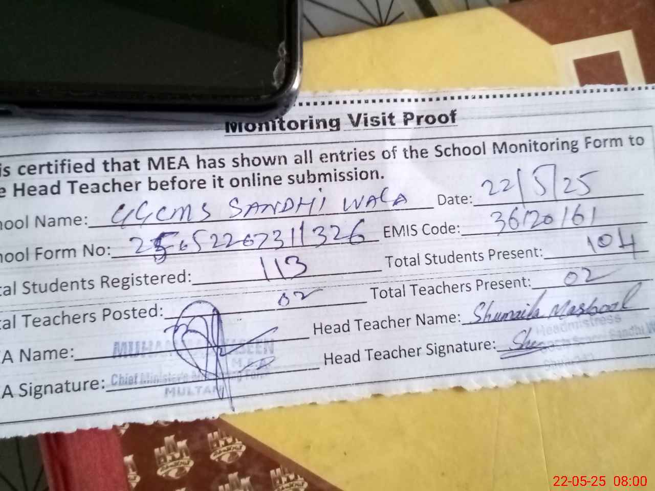 | Attendance Register | Head Teacher | MEA with School | Visit Proof |
