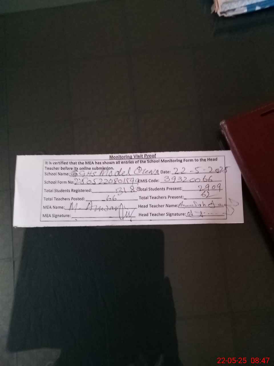 | Attendance Register | Head Teacher | MEA with School | Visit Proof |