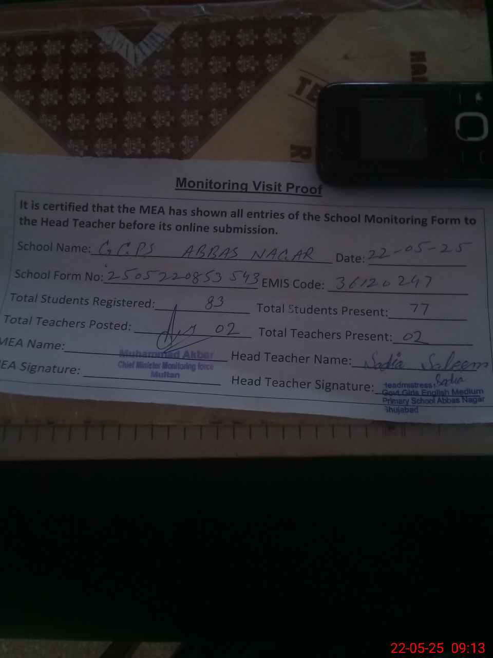 | Attendance Register | Head Teacher | MEA with School | Visit Proof |