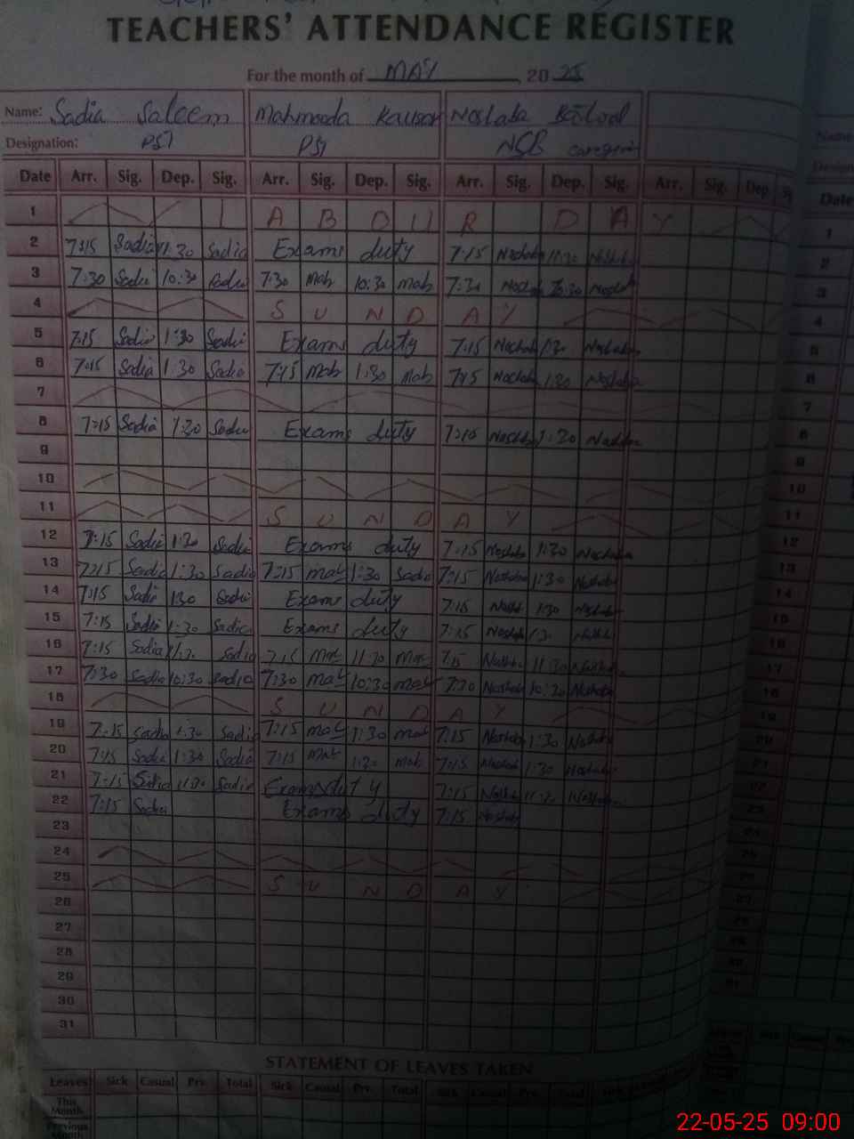 | 36**** | Ma**** Ka**** | 2 | 2 | 0 | 0 | 0 | 0 | 0 | 0 | 0 | 0 | 0 | Exam Duty |