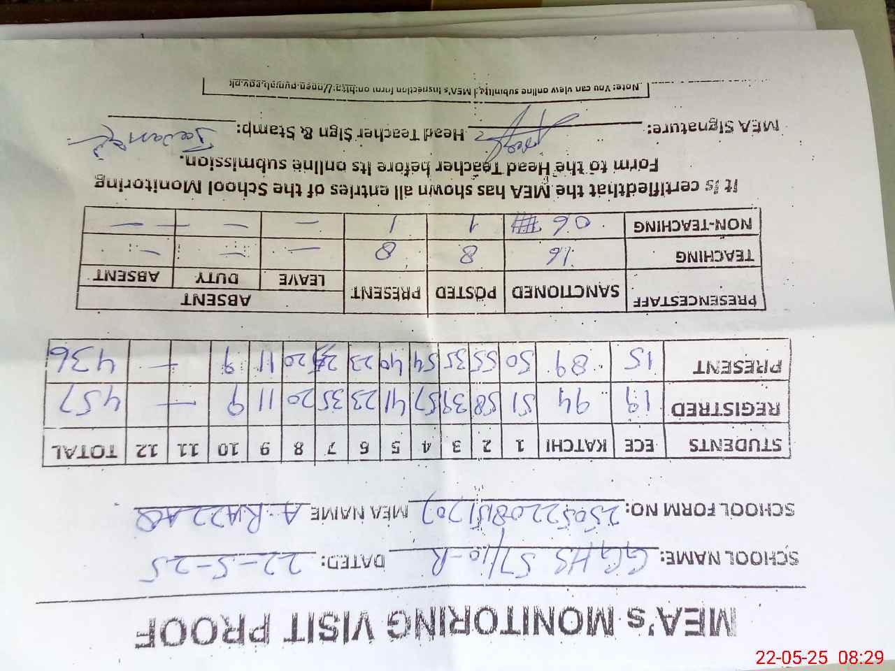| Attendance Register | Head Teacher | MEA with School | Visit Proof |