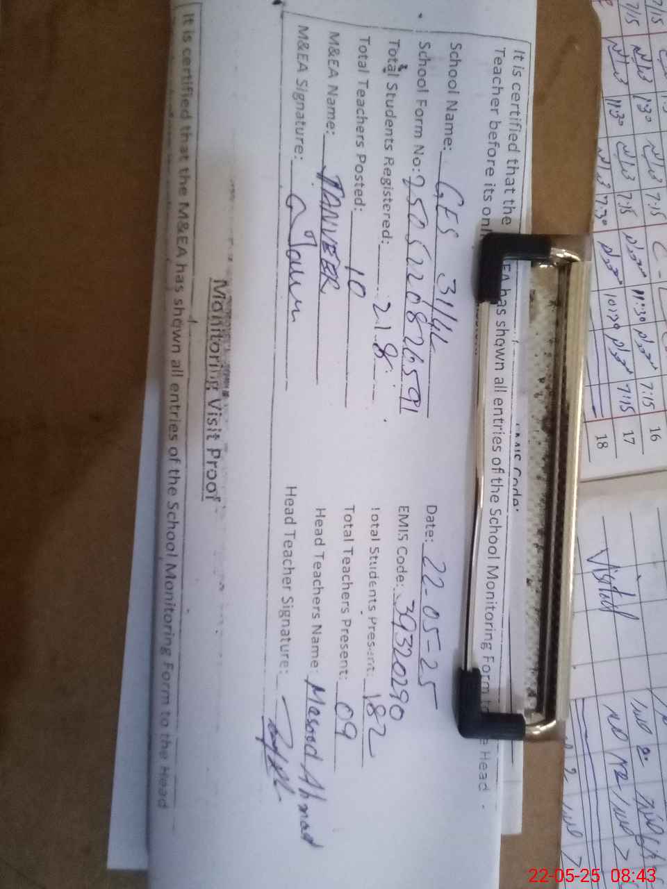 | Attendance Register | Head Teacher | MEA with School | Visit Proof |