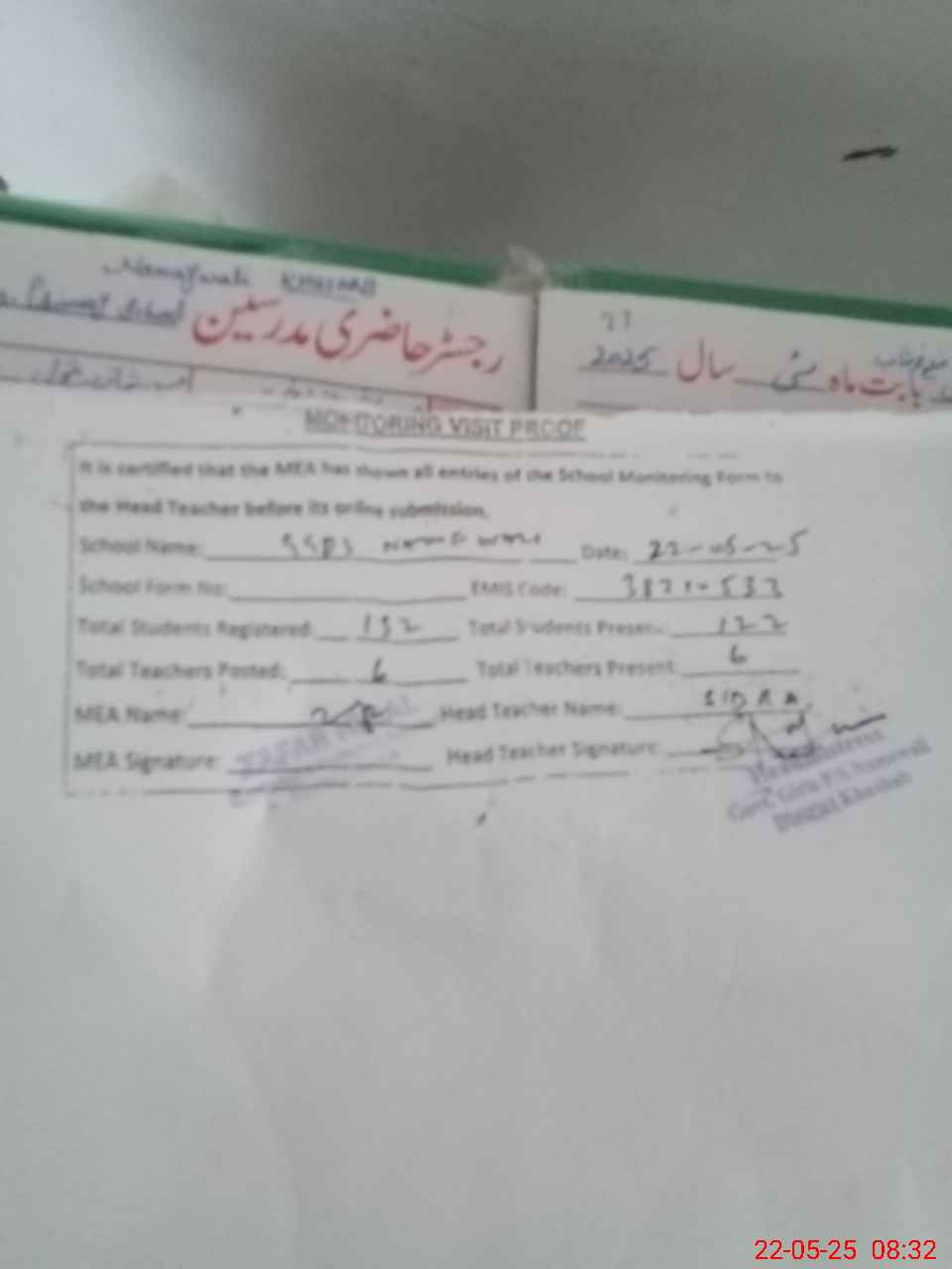 | Attendance Register | Head Teacher | MEA with School | Visit Proof |
