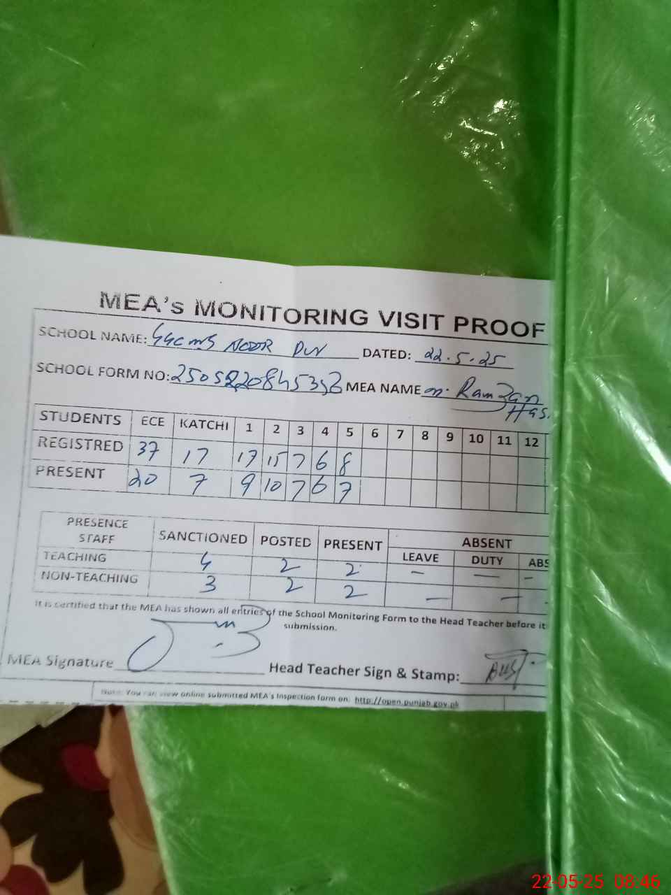 | Attendance Register | Head Teacher | MEA with School | Visit Proof |