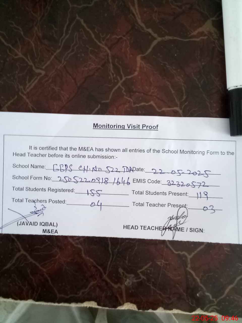 | Attendance Register | Head Teacher | MEA with School | Visit Proof |