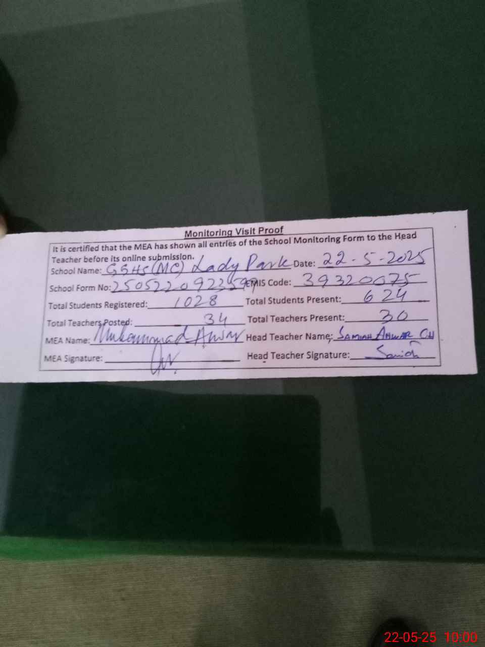 | Attendance Register | Head Teacher | MEA with School | Visit Proof |