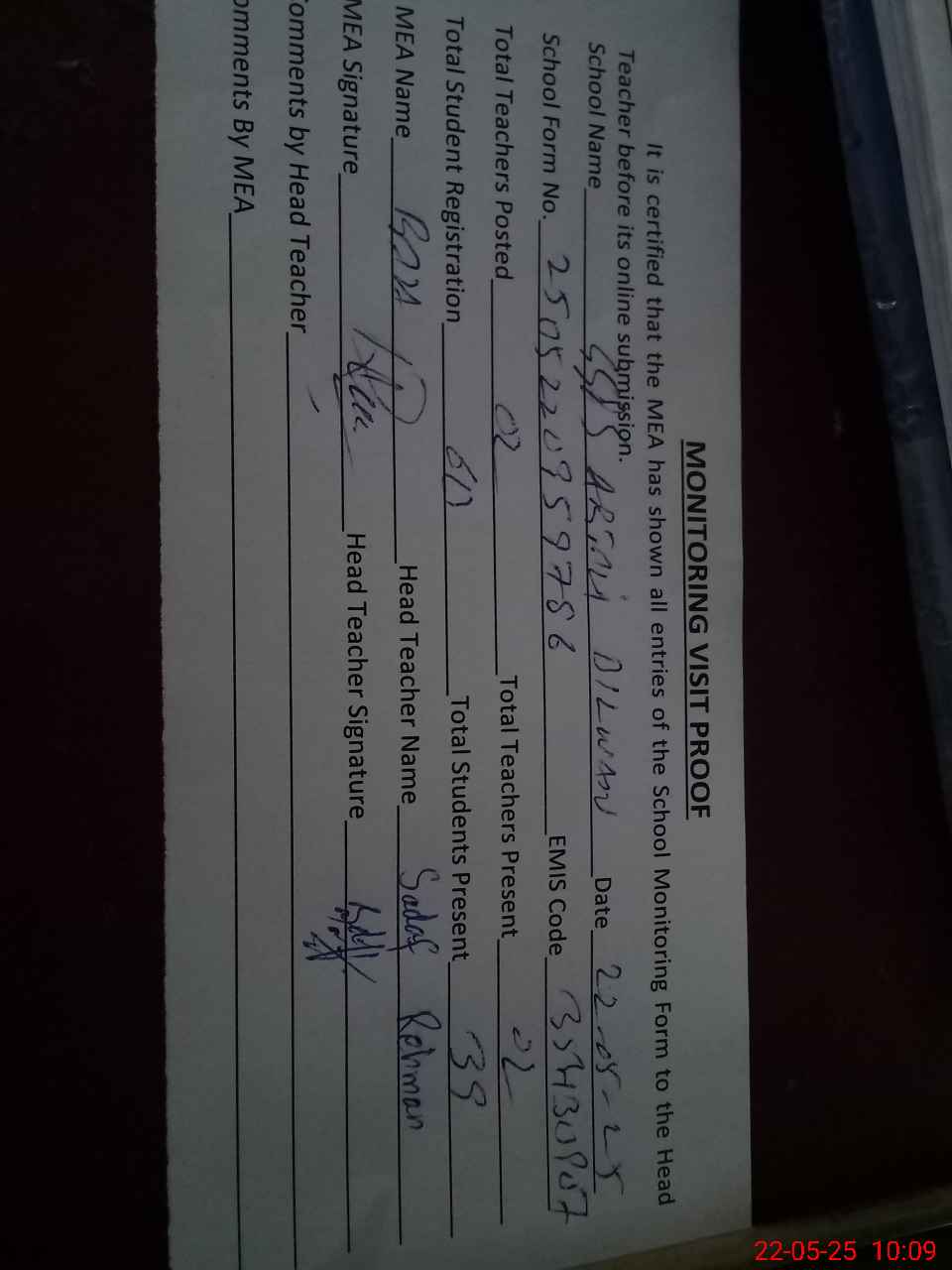 | Certified that this School was Inspected by the Undersigned MEA/DMO Today and the Information Stated Above is as Per Record. | |||||