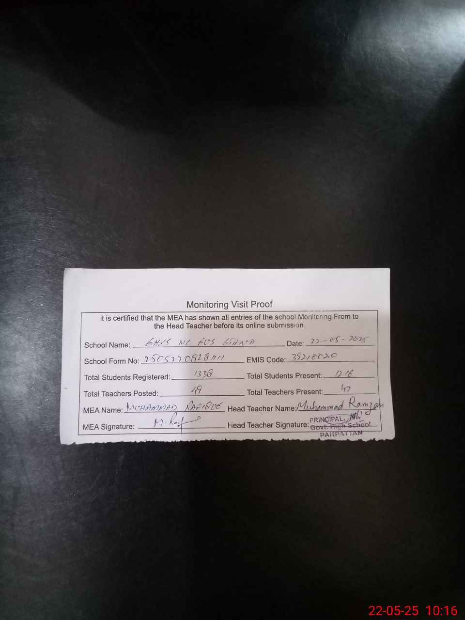 | Certified that this School was Inspected by the Undersigned MEA/DMO Today and the Information Stated Above is as Per Record. | |||||