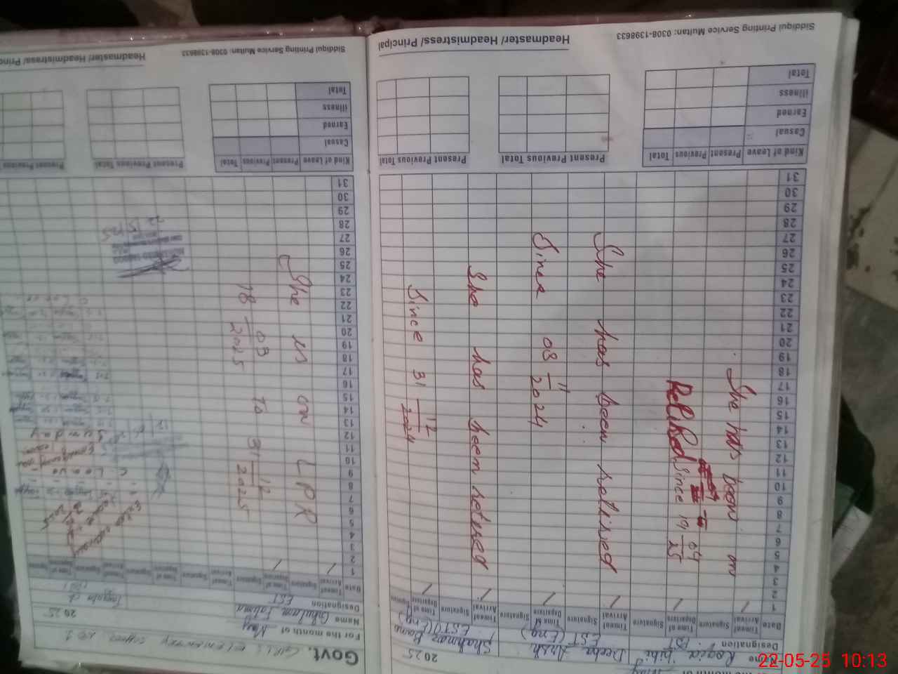 | CNIC | Full Name | Designation | R/C | Absence During Last Calender Month |