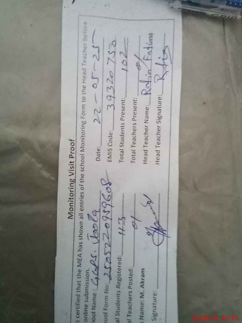 | Attendance Register | Head Teacher | MEA with School | Visit Proof |