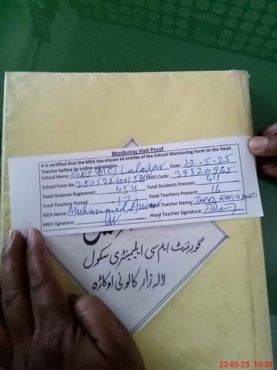 | Certified that this School was Inspected by the Undersigned MEA/DMO Today and the Information Stated Above is as Per Record. | |||||