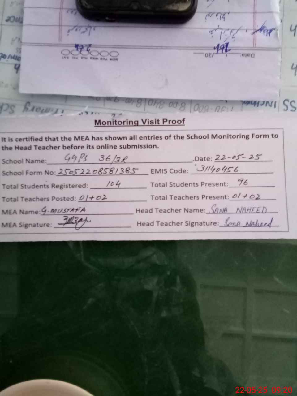 | Attendance Register | Head Teacher | MEA with School | Visit Proof |